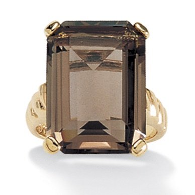 Une bague d'une élégance rare avec son style classique et sa couleur exquise. Le quartz fumé de 13 carats présente une taille à degrés façon émeraude pour un effet sophistiqué poussé à l'extrême. Plaqué or 14 ct (585). Tailles 49 à 61. (le poids annoncé peut varier de plus ou moins 5 %).