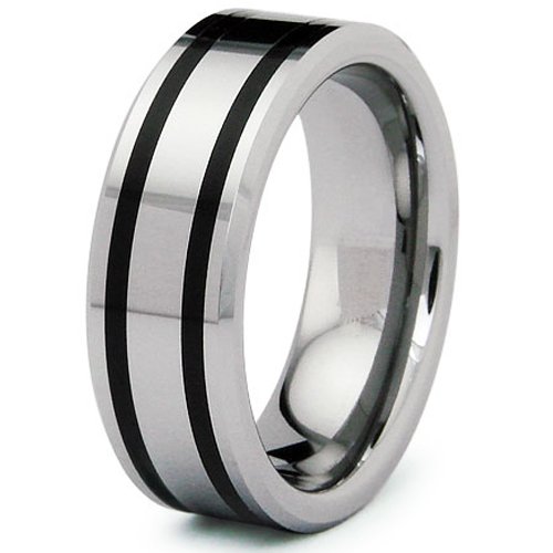 Le 8mm large bande de mariage de tungstène est discret mais élégant. Il existe deux rainures sur le bord qui encadrent la zone centrale. Ajoute un intrique intéressant de la bande de tungstène plat.