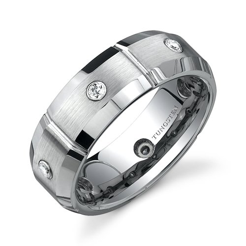 Revoni Tour de Force - Bague alliance en Tungstène brossé sertie d'Oxyde de Zirconium - Inspiration à bords biseautés pour homme - Larg. 7 mm - Taille 66
